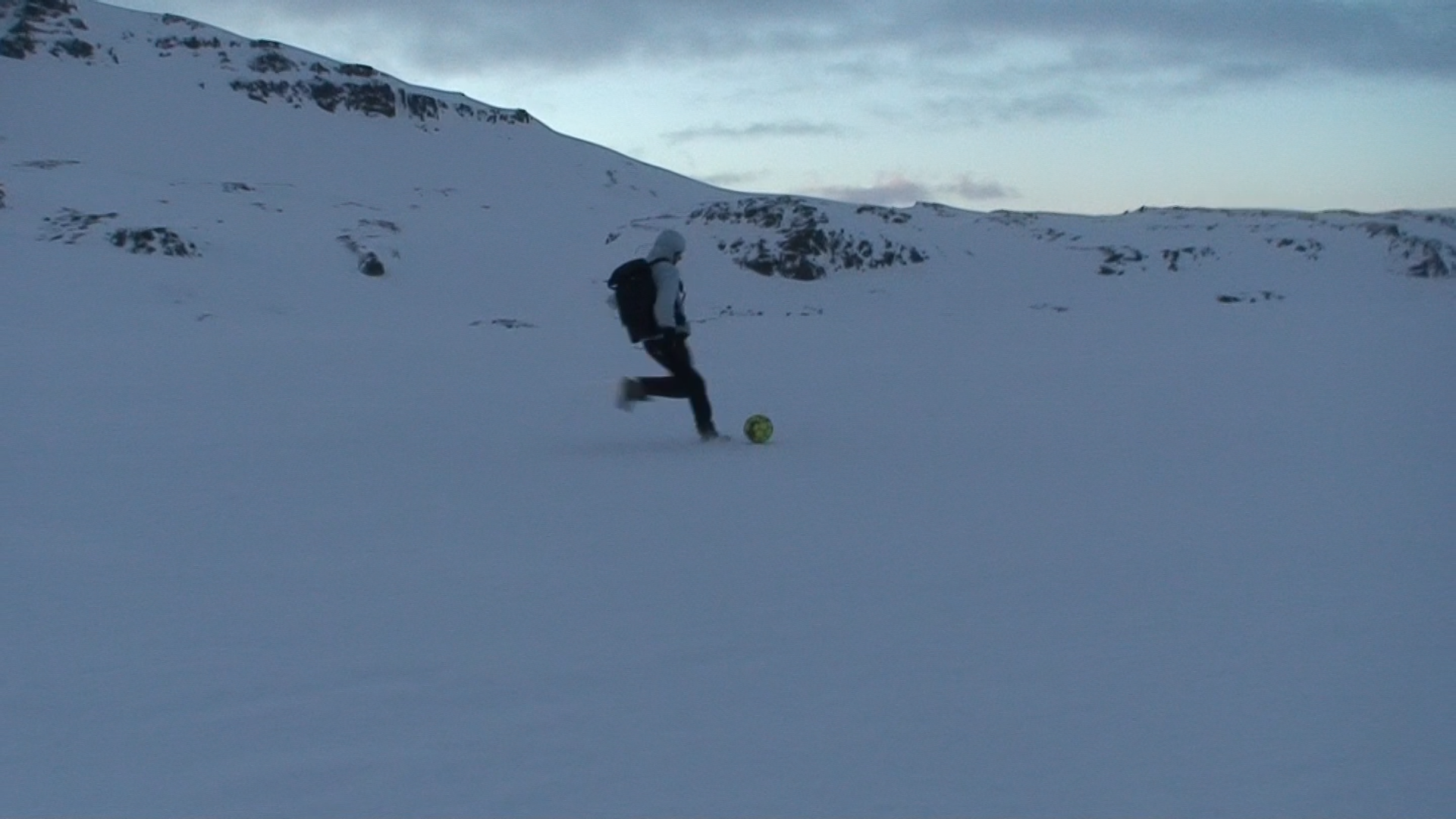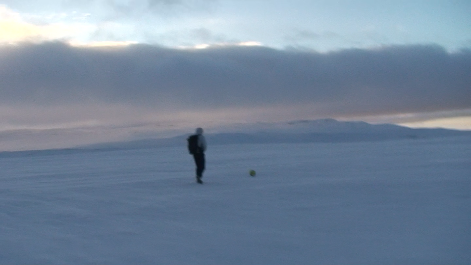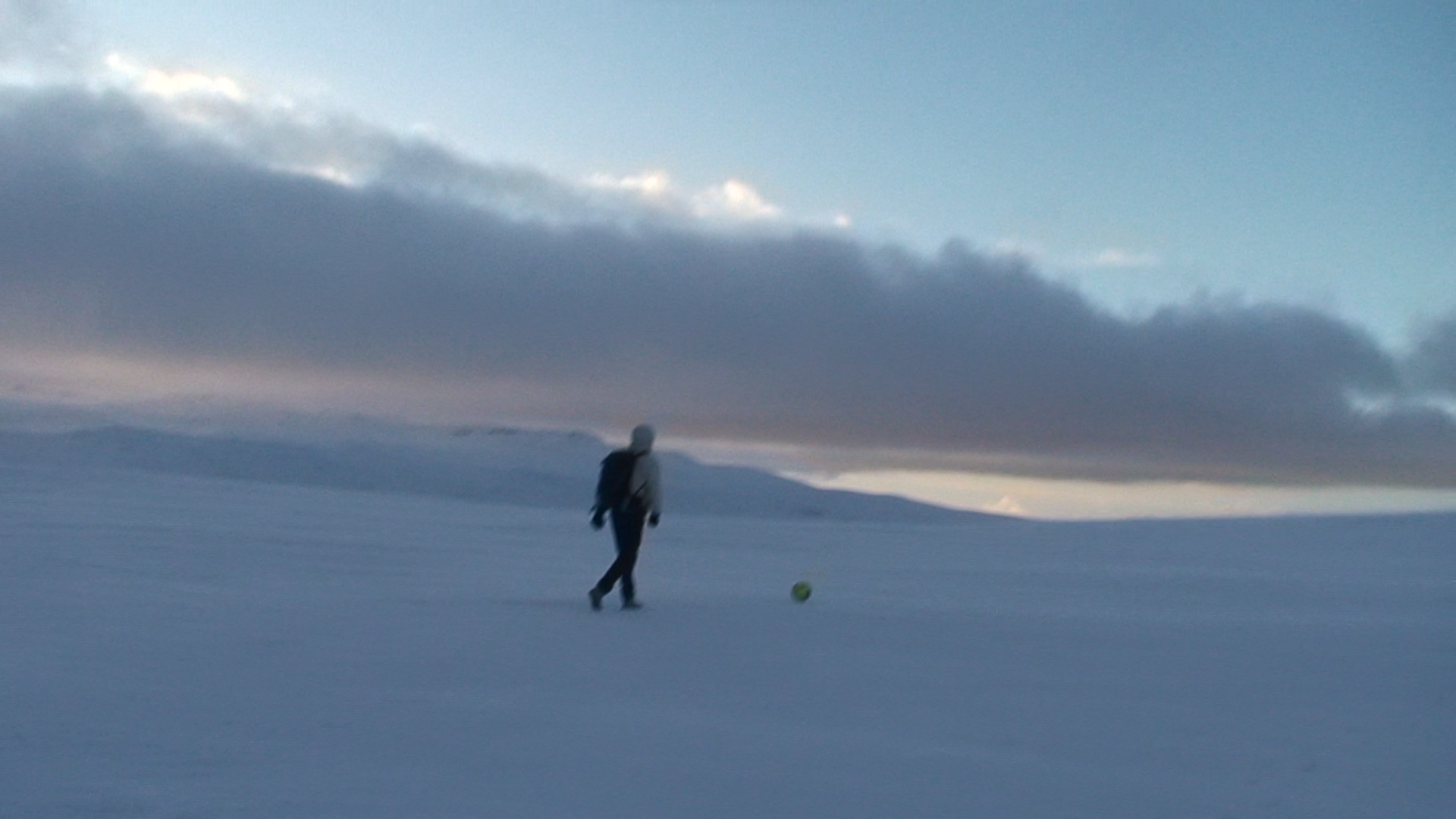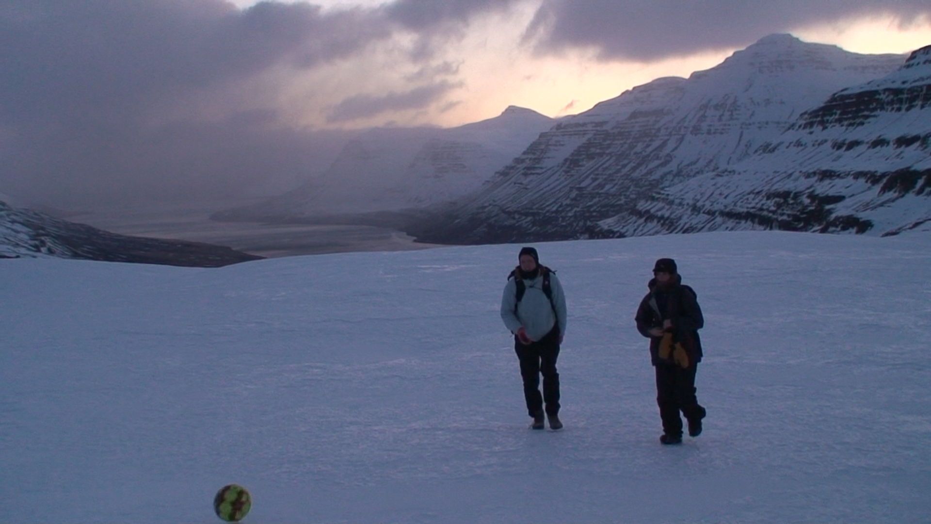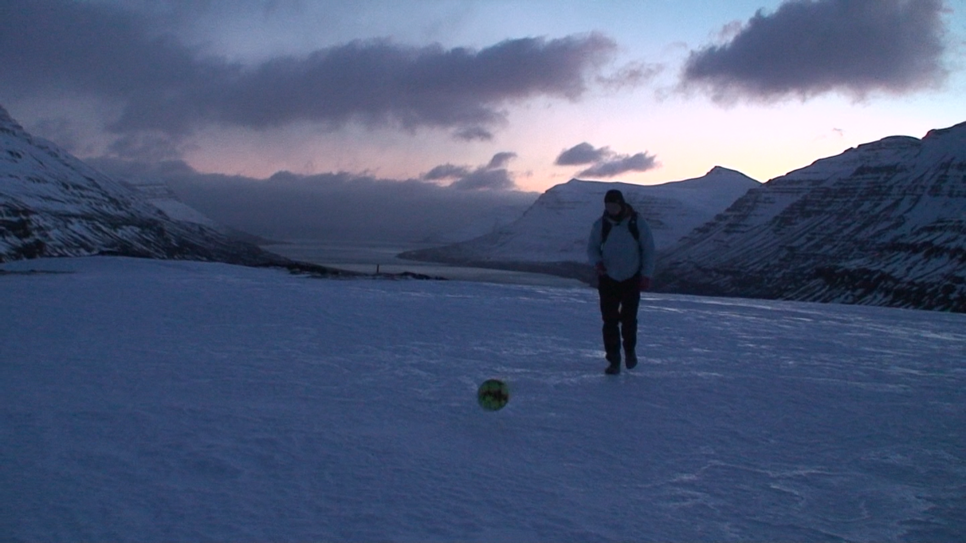 Images and video documentation of a walk between Seyðisfjörður and Egilsstaðir where a football is kicked 2255 times to measure the distance between.
