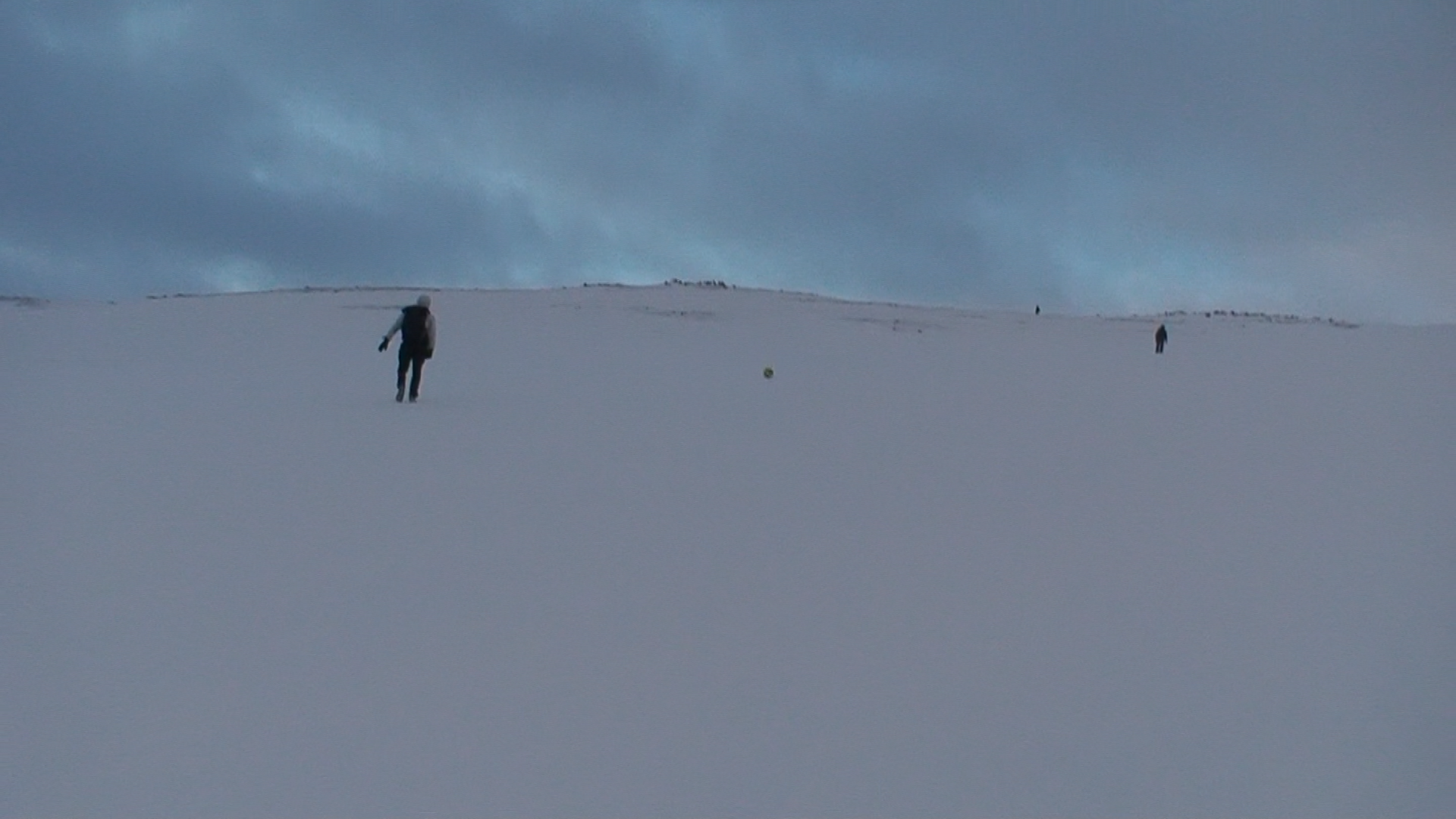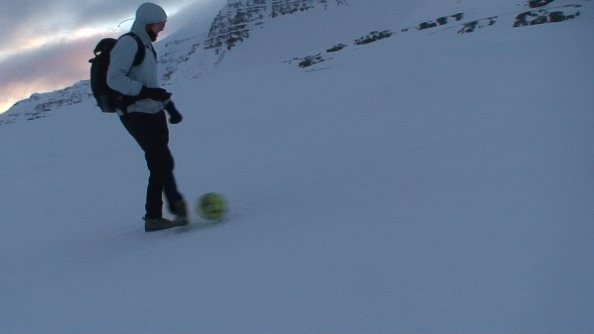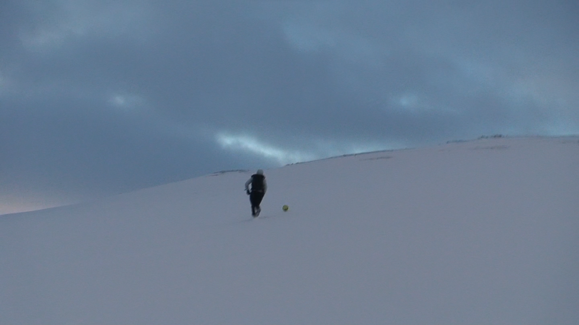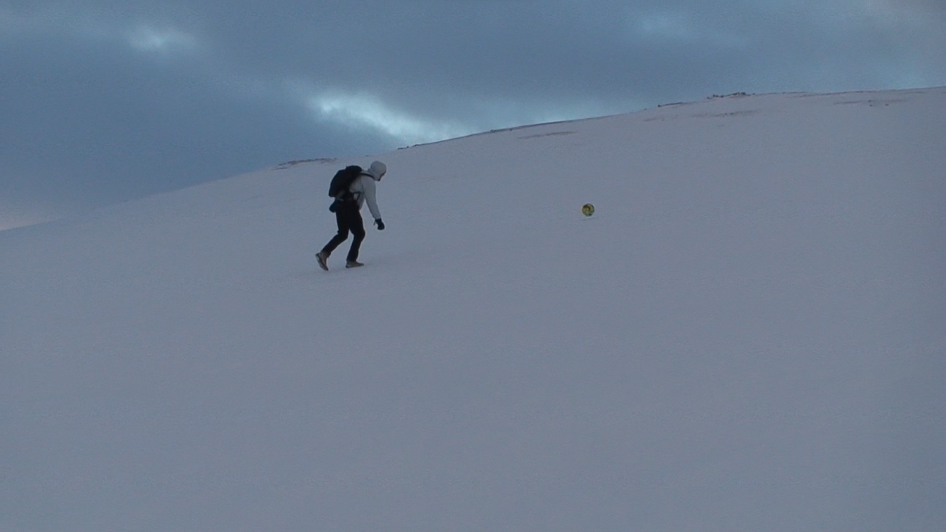 Images and video documentation of a walk between Seyðisfjörður and Egilsstaðir where a football is kicked 2255 times to measure the distance between.